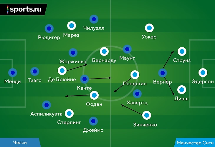 «Челси» лишал «Ман Сити» свободного игрока через выдвижения Рюдигера и Аспиликуэты, по эпизоду перестраиваясь на четверку защитников.