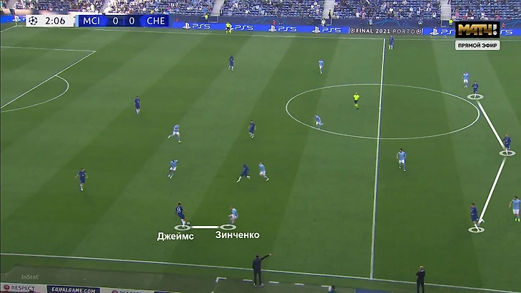 Сначала Зинченко пытался сразу выдвигаться на Риса Джеймса, но такая ситуация создавала 3-в-3 в последней линии:
