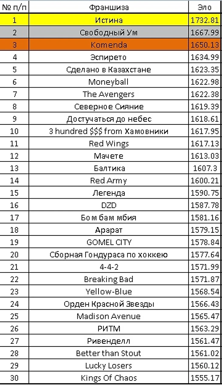1) Рейтинг Антона Анисимова . Считает сумму ФО первых 6 человек франшизы в каждом отдельном турнире, после чего выводит общую сумму. Данным рейтингом мы закрываем аспект общей силы команды.