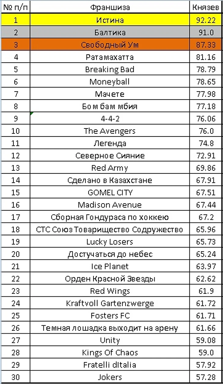 Полную таблицу рейтинга Князева можно посмотреть по ссылке.