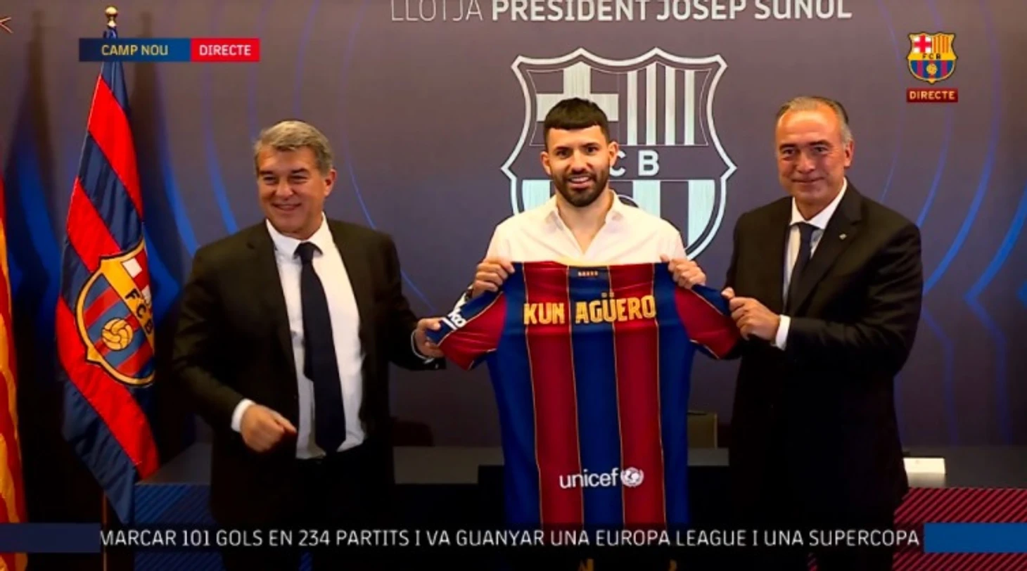 Серхио Агуэро стал первым трансфером «Барселоны» перед сезоном 2021\22. В презентации футболиста принимают участие Жоан Лапорта, Рафа Юсте и Матео Алемани.