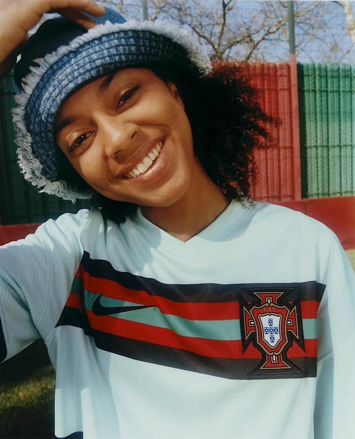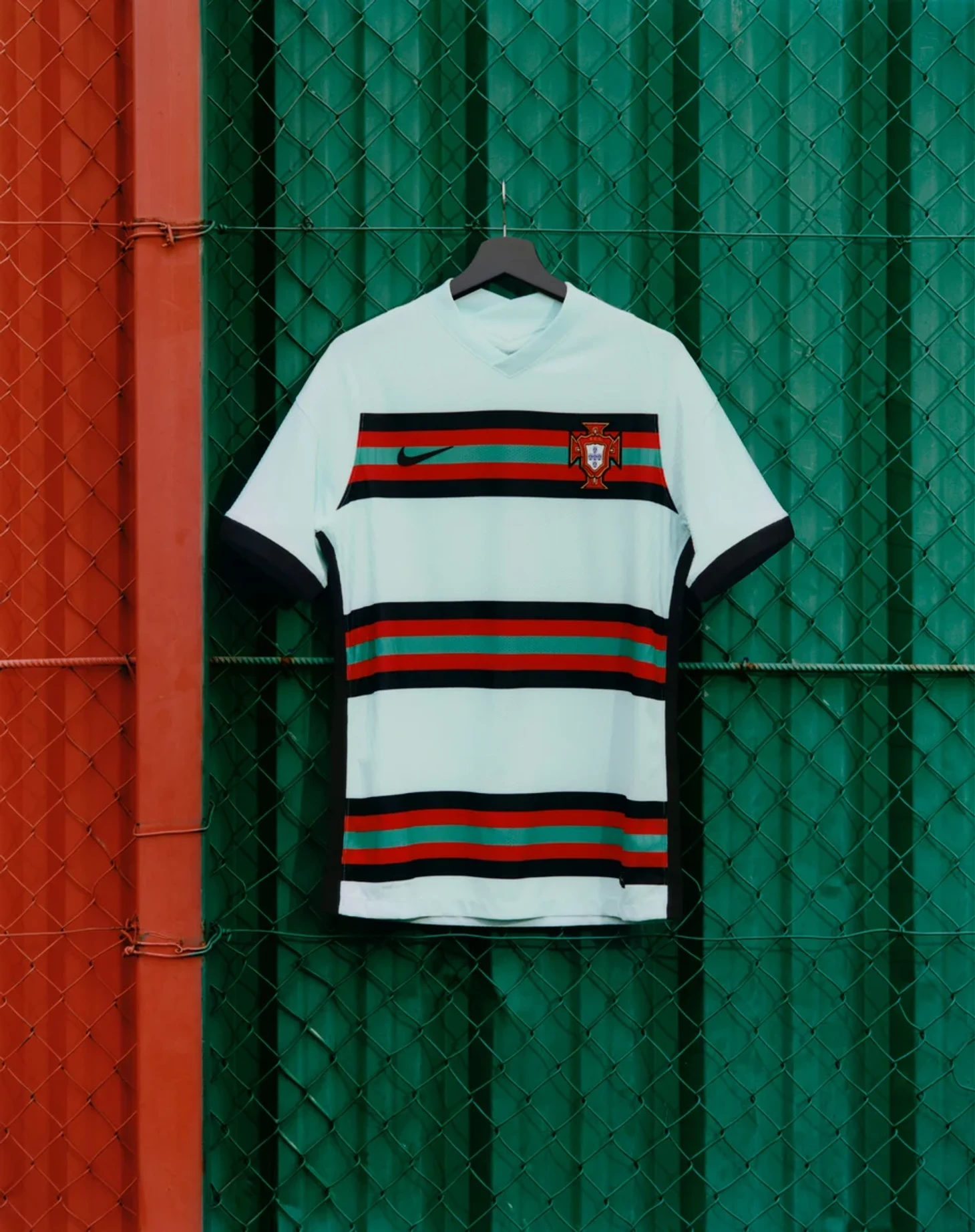 Сборная Португалии отправится на турнир в качестве действующего чемпиона, поэтому отсылка к прошлому турниру была просто необходима. Фоновый бирюзовый цвет джерси вдохновлен выездной футболкой с Евро-2016, в которой был выигран финал.