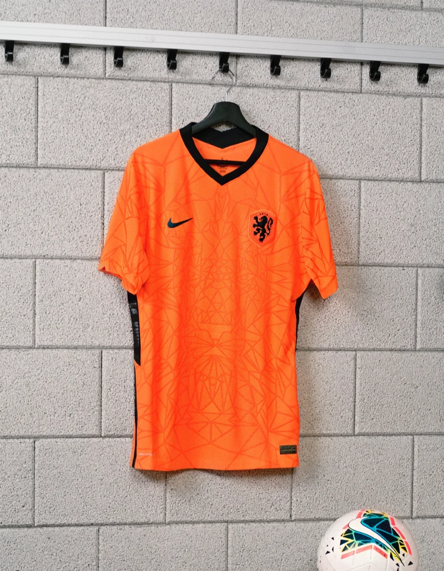 Главную фишку этого сезона — зигзагообразные полосы дополнили буквами KNVB, аббревиатурой Королевского футбольного союза Нидерландов.