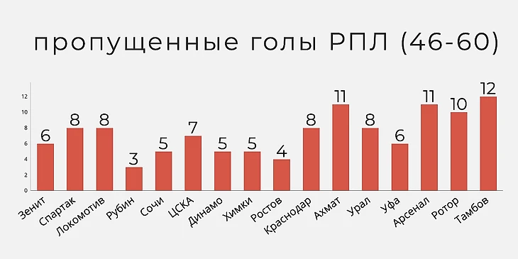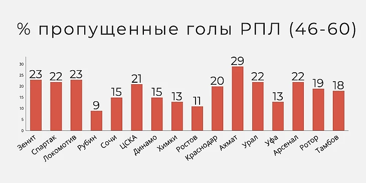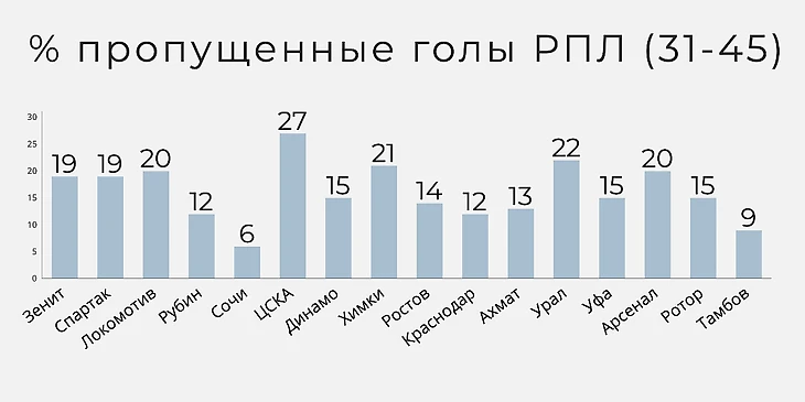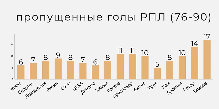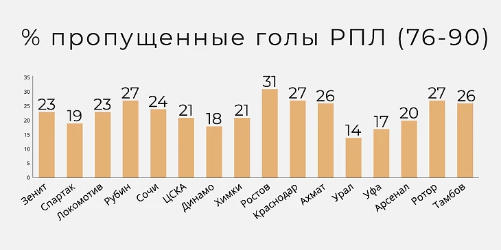 Лучше всех концовки матчей дались обороне Урала, только 5 (14%) мячей они пропустили начиная с 76 минуты игры. В остальном, отметим довольно высокий средний процент пропущенных командами мячей в завершающей стадии игры.