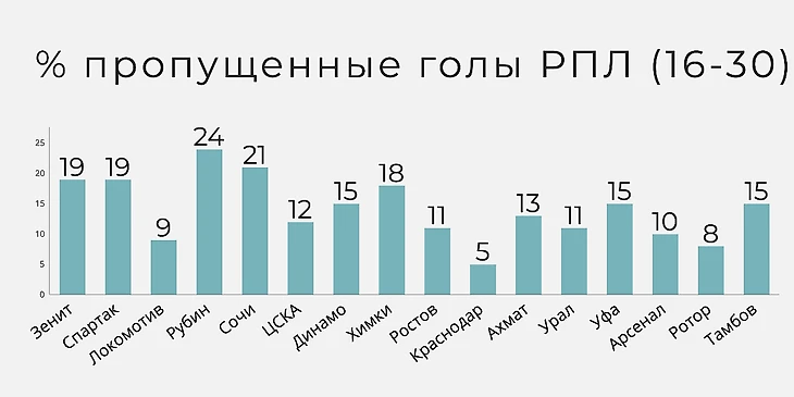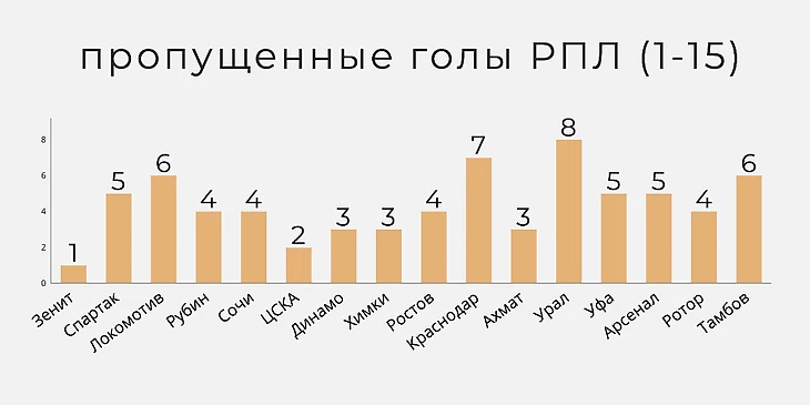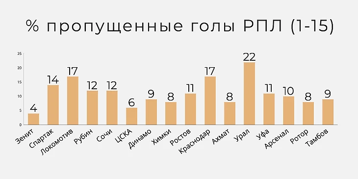 Только один раз удалось поразить ворота Зенита его соперникам в первые 15 минут игры. Всего на один мяч больше допустили в свои ворота игроки ЦСКА, что тоже является хорошим показателем. В худшую стороны выделяются Урал с 8 мячами (22%) и Краснодар с 7 (17%).