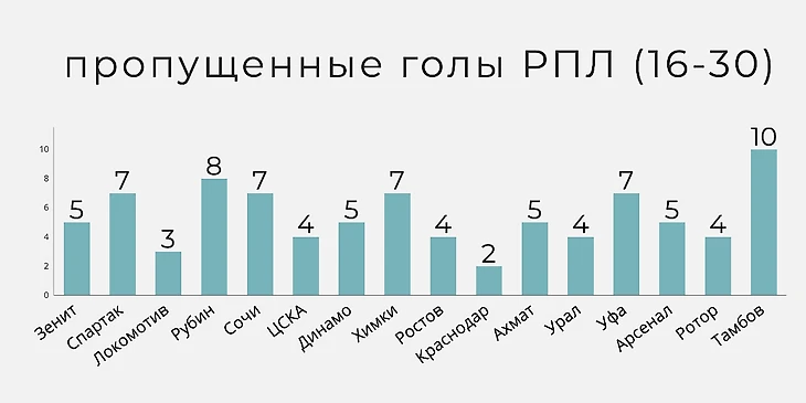 По количеству пропущенных мячей в середине первого тайма лидирует Тамбов, целых 10 раз мяч побывал в их сетке ворот. Неудачно складывался этот отрезок матча и для Рубина, они пропустили 24% (8) всех своих мячей именно в этот период времени, что является худшим показателем среди всех команд на аналогичном промежутке. Лучше всего удавалось отыграть в обороне на этом этапе матча игрокам Локомотива и Краснодара, пропустив всего 3 и 2 мяча соответственно.