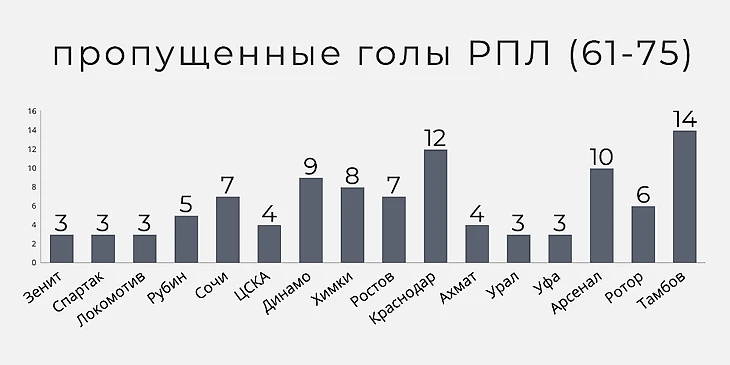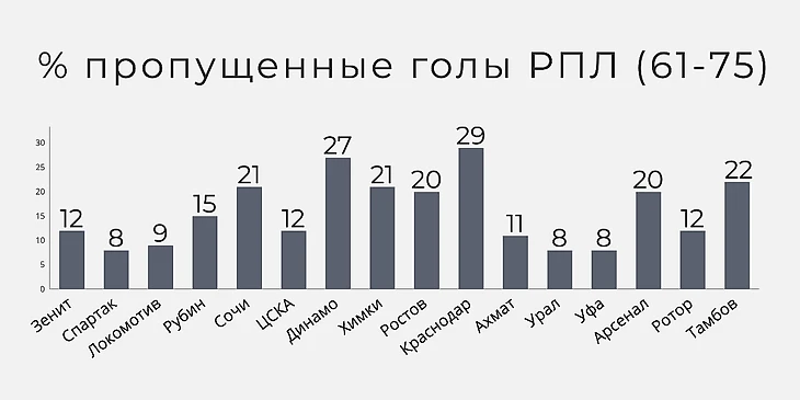 Середина второго тайма оказалась неудачной для оборон команд из середины таблицы - Динамо, Химки, Ростов и Краснодар. Больше всех здесь выделяется Краснодар - 29% и 12 мячей соответсвенно. В количественном измерении хуже остальных оказался Тамбов - 14 мячей залетело в сетку их ворот в эти 15 минут.