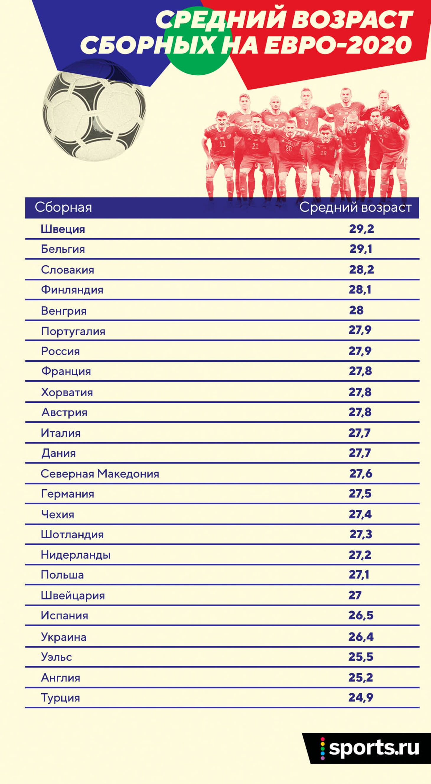Самые молодые составы у Турции (24,9 года), Англии (25,2), Уэльса (25,5), Украины (26,4) и Испании (26,5).