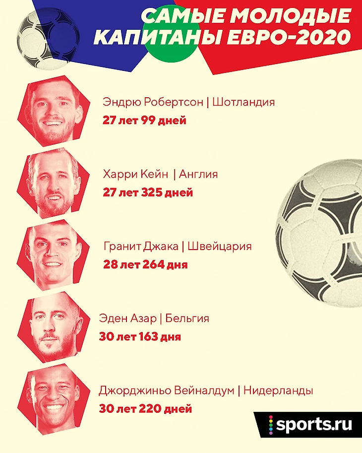 На Евро будут даже капитаны младше 30 лет – Эндрю Робертсон (44 матча за Шотландию), Харри Кейн (54 за Англию) и Гранит Джака (93 за Швейцарию). Робертсон и Кейн, кстати, уже проверенные временем лидеры – оба получили капитанскую повязку еще в 2018 году.