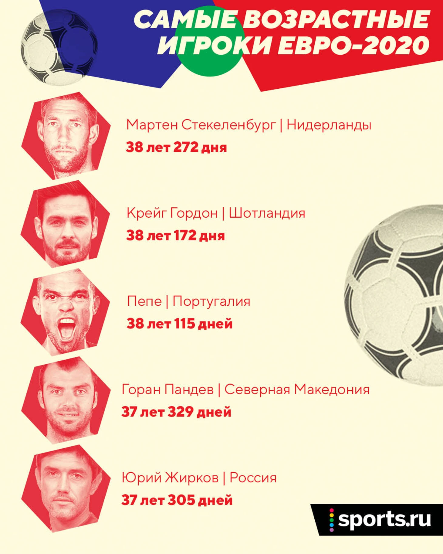 В топ-5 самых возрастных футболистов всего два вратаря: Мартен Стекеленбург и Крейг Гордон. Оба будут запасными вариантами, зато среди полевых – важнейшие персоны. Пепе остается оплотом португальской защиты, Горан Пандев – ключевая фигура скромной Северной Македонии, а Юрий Валентинович Жирков все еще закрывает левую бровку нашей сборной.