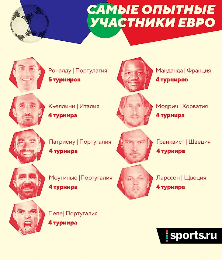 Криштиану Роналду – главный ветеран чемпионатов Европы, он едет уже на пятый турнир. Кстати, догнал по количеству Евро Икера Касильяса, причем испанский кипер дважды (в 2000-м и 2016-м) не выходил на поле. Впереди – никого, так что Роналду может замахнуться на единоличный рекорд. В 2024-м ему будет 39.