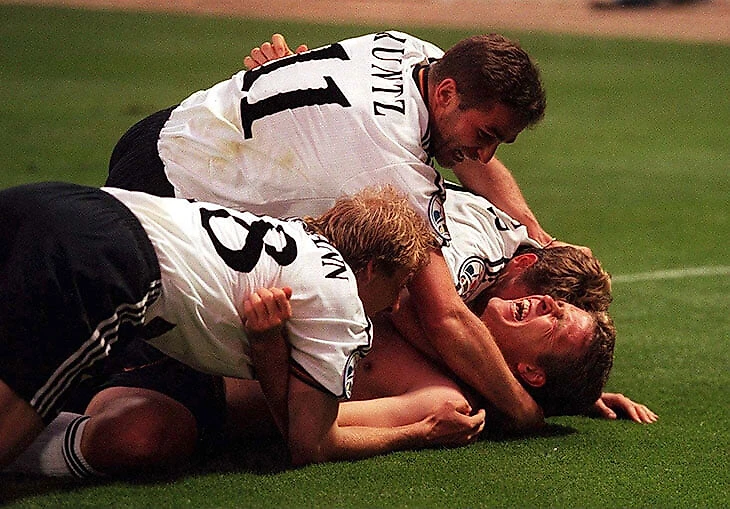 А в полуфинале настала пора реванша за гол-фантом Джеффа Херста в решающем матче ЧМ-1966. Тридцать лет спустя те же соперники вышли на все тот же «Уэмбли», но теперь успех праздновали гости. 1:1 в основное время, а в серии пенальти Андреас Кепке взял удар нынешнего тренера англичан Гарета Саутгейта. В финале подопечных Берти Фогтса ждали сенсационные чехи, которые в плей-офф выкинули Португалию с Луишем Фигу и Францию с Зинедином Зиданом.