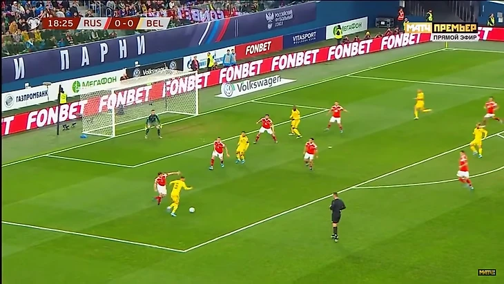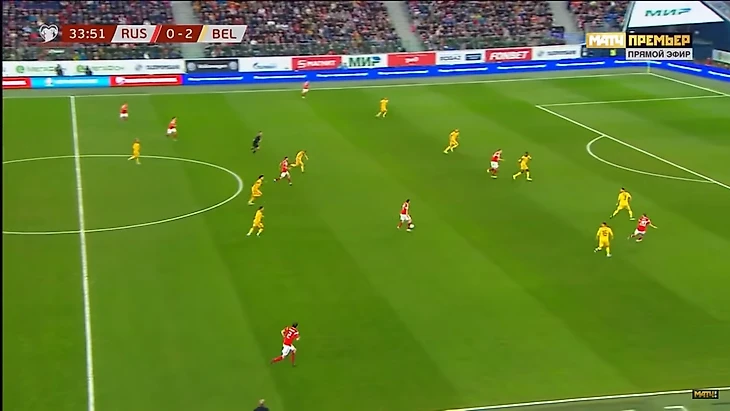 У Бельгии есть проблема, которая по сути входит в модель игры – поскольку трое игроков остаются впереди, а семеро обороняются, площадь перед штрафной часто пустует – опускаться/подниматься туда некому и часто соперники бельгийцев наносят удары именно оттуда – в качестве примера возьмем ситуацию из матча Россия-Бельгия 2019 года.
