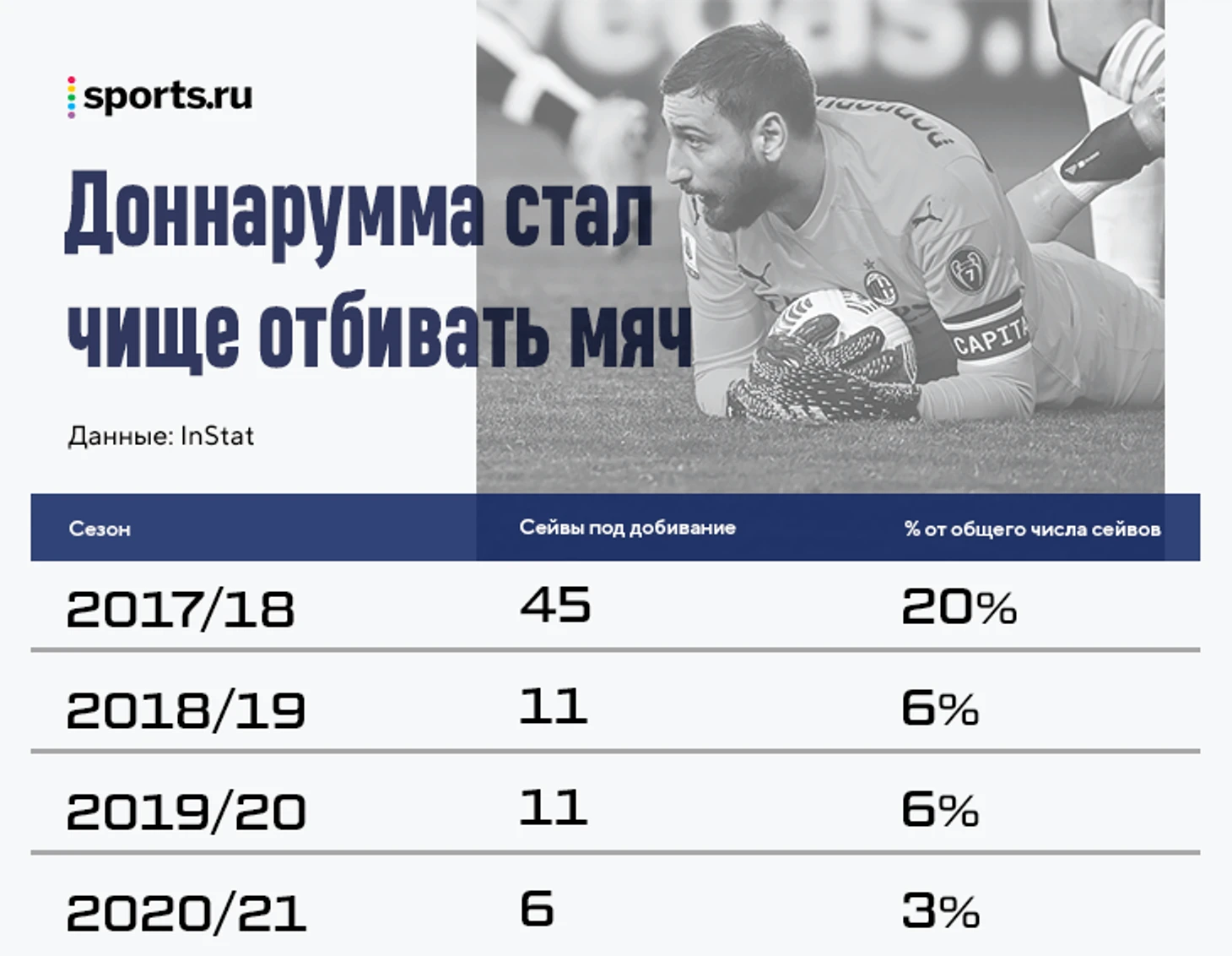 Еще одна важная деталь в этой модели не отображается – насколько чисто Доннарумма отбивает мячи. В этом отношении итальянец сильно вырос за последние сезона – теперь всего 3% из отбитых им ударов ведут к добиванию: