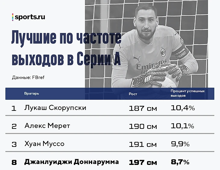 Доннарумма не очень часто ошибается на выходах, но идет на подачи очень избирательно. Из основных вратарей Серии А он лишь восьмой по проценту успешных выходов: