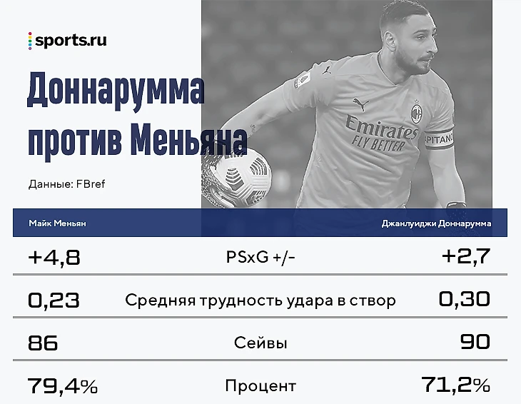 Это делает картину по Доннарумме более полной, а его – чуточку круче. В целом его шотстоппинг на хорошем уровне. Если бы он дополнялся топовостью в других аспектах, то вопросов не было бы вообще. Но если мы рассматриваем отражение ударов как его сильнейшую сторону, то планка повышается. Например, Майк Меньян, которого покупает «Милан», провел более сильный сезон в этом отношении: