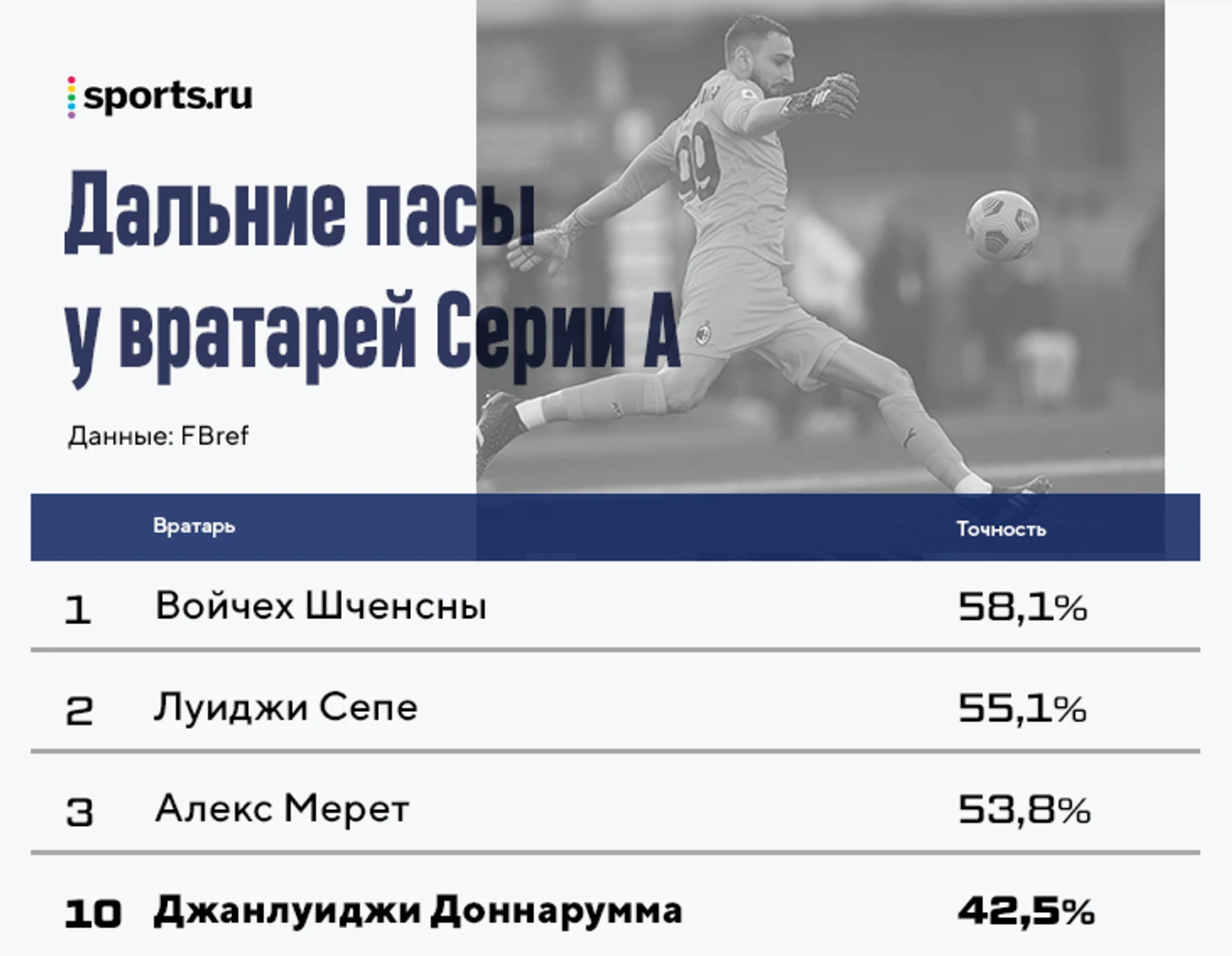 Тут тоже наблюдается определенная зависимость от стиля и адресатов (хотя это далеко не всегда вынос, порой таким образом кипер переводит мяч), но точность дальних дает большее понимание качества паса самого кипера. У Доннаруммы ничего выдающегося, но далеко не провал. Например, лучше, чем у Меньяна (35,0%).