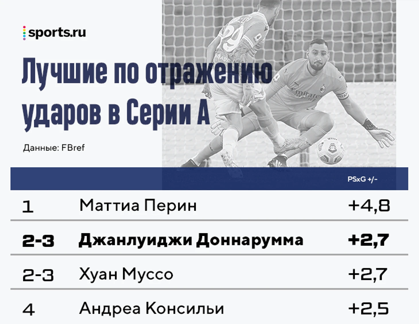 Это достойный результат, но не выдающийся, особенно если мы сравним не только с кризисной по части топ-киперов Серией А, а со всей Европой – у Яна Облака, например, +9,8. И совсем не выдающийся, если мы оцениваем Доннарумму по шкале топ-вратарей, а отражение ударов считаем его сильнейшей стороной.
