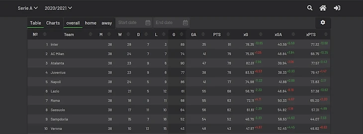 Перед тем как начать, стоит отметить, что xG - количество ожидаемых голов от одного футболиста или всей команды, вычисляется, исходя из качества нанесенных ударов. xGA - количество ожидаемых голов со стороны соперника, вычисляется, исходя из качества нанесенных ударов. хPTS - ожидаемое количество очков, которое команда набрала в чемпионате, судя по вычислению xG и xGA.