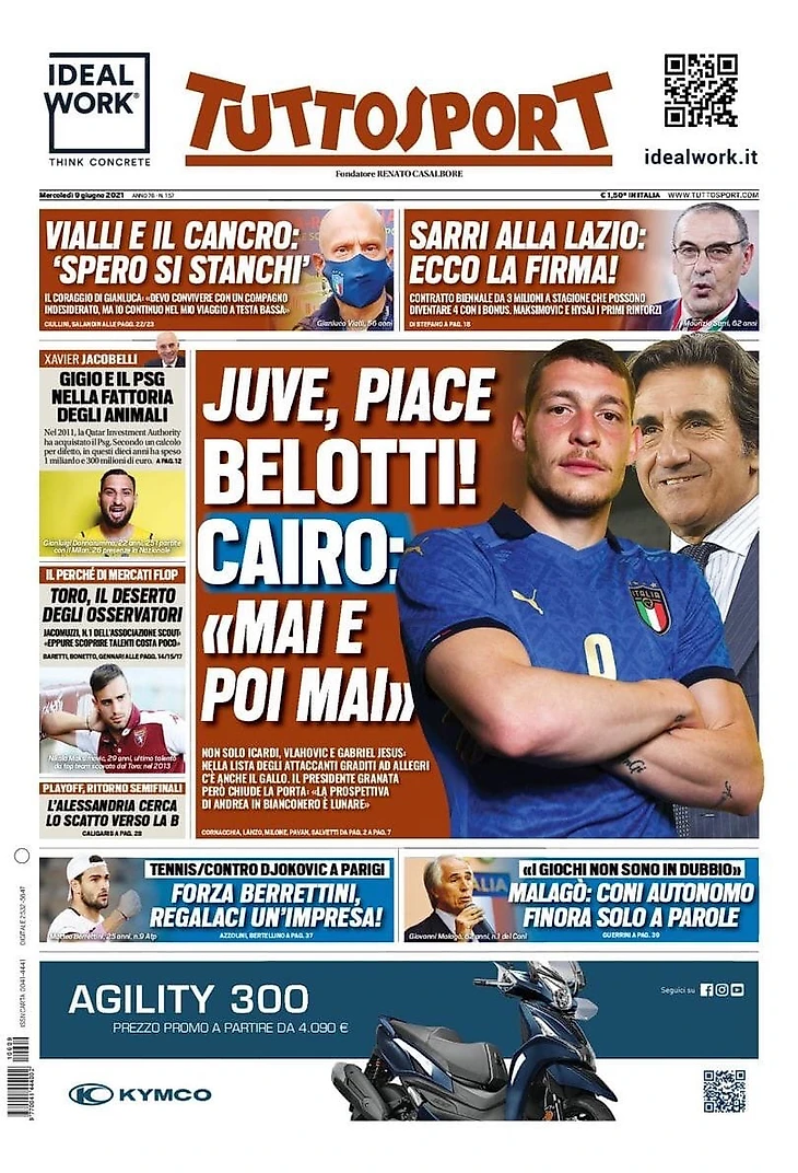 Скорый старт Чемпионата Европы, интерес «Юве» к Белотти, а также подписание контрактов Сарри с «Лацио» и Доннаруммы с «ПСЖ» – в утреннем обзоре заголовков итальянских спортивных изданий в блоге «В гостях у Кальчо».