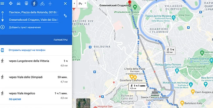 Стадио Олимпико располагается в 5 километрах от центральной площади и Пантеона. Туристы смогут за час дойти оттуда пешком, наслаждаясь местными достопримечательностями. Подробный маршрут указан на фото.