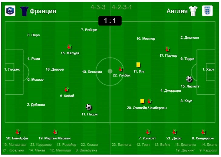 Замены: Гарет Барри 46’ -> Джермейн Дефо, Джо Коул 80’ -> Даррен Бент, Шон Райт-Филлипс 46’ -> Дэвид Бекхэм.