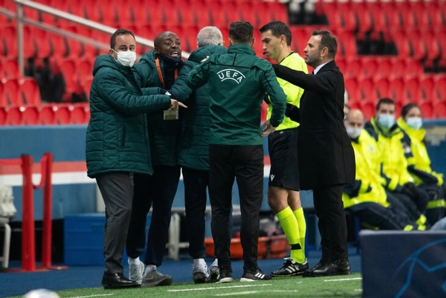 На 14-й минуте Хацеган среагировал на конфликт за пределами поля. Ассистент тренера «Истанбула» Пьер Вебо спорил с Кольцеску. Хацеган уточнил, кому конкретно нужно показать красную – Шовре показал на Вебо: «Желтую ему! Этому черному. Такое нельзя делать. Иди и посмотри, кто это. Черный вон там. Нельзя такое делать».