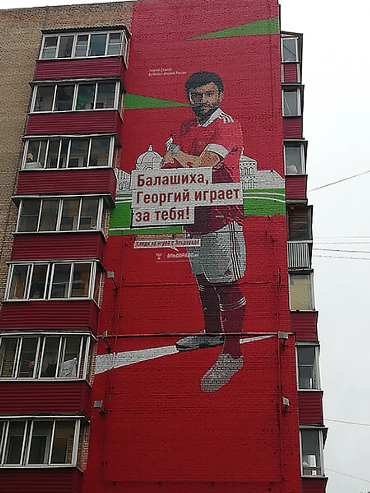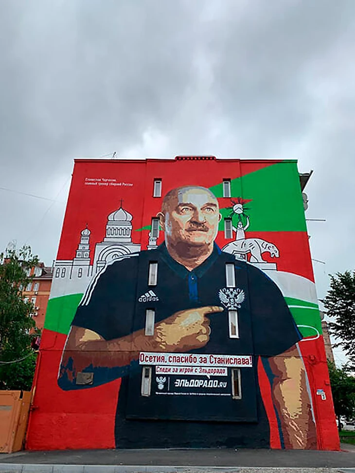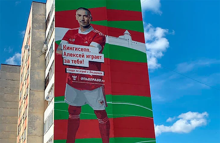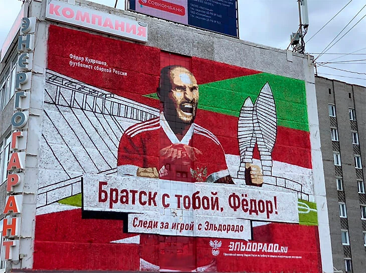 Футболисты сборной России родились не только в Москве и Петербурге. Чтобы напомнить игрокам, какую большую страну они представляют, а фанатам – дать еще один повод поболеть за команду, компания «Эльдорадо» устроила городской перформанс. На стенах домов во Владикавказе, Братске, Кингисеппе и Балашихе появились огромные изображения футболистов сборной.