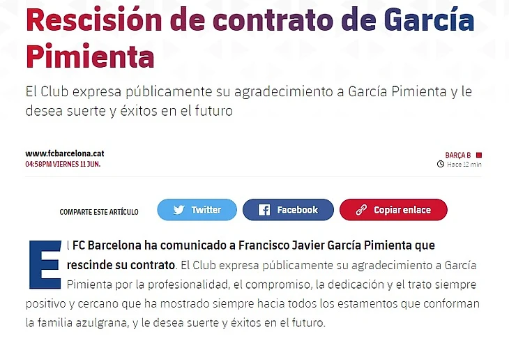 P.s. Данная новость сейчас существует только в твиттер-аккаунте «Барсы Б». Ни один из многочисленных клубных аккаунтов (@FCBarcelona, _cat, _es и пр.) никак не объявил об этом. Ни своими словами не отметил свою благодарность Пимьенте, ни ретвитнул мини-публикацию аккаунта второй команды...