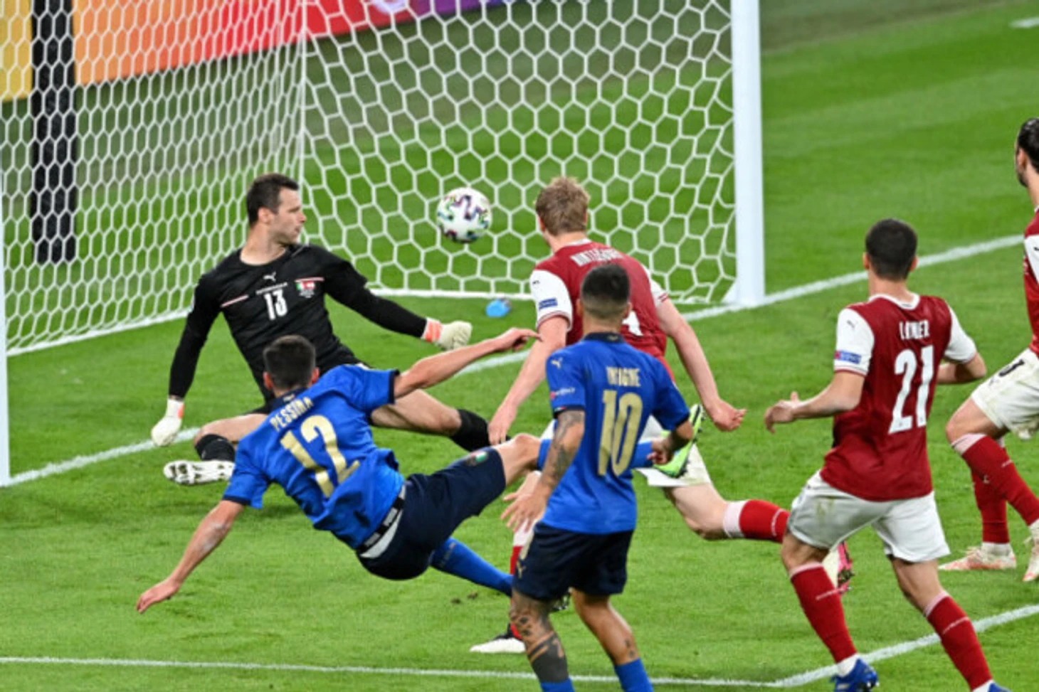 Австрийцы открывают счет уже очень и очень рано. Атака австрийцев левым флангом завершилась диагональной передачей верхом от Марселя Забицера: Штефан Лайнер замкнул эту голевую передачу. После забитого гола, к слову, в кадры трансляции попала белая майка с пожеланиями в адрес Кристиана Эриксена, которую держал Лайнер.
