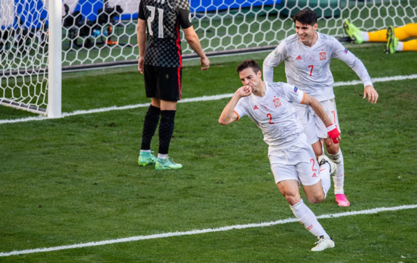 И вот испанцы, не затягивая время, открывают счет, да еще и чужими ногами! Заработала пиренейская команда угловой: подавал с правого фланга Коке, мяч доставлен через штрафную верхом на Жорди Альбу, тот наносит не особо опасный удар. Однако в этот момент мяч рикошетит от ноги Дениса Закарии и залетает в верхний угол ворот Яна Зоммера. УЕФА, изначально записав гол на Жорди Альбу, переписывает его на несчастного Закарию: итого у нас теперь 10 автоголов на этом турнире.