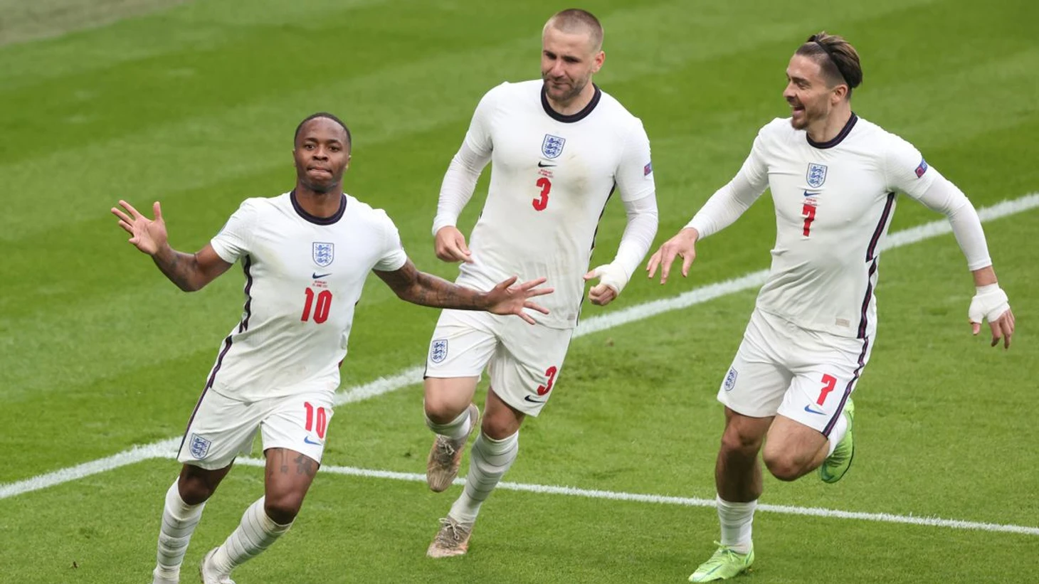 Открывает счет Англия! Отличную комбинацию начал Харри Кейн: далее с правого фланга следует цепочка передач Джек Грилиш – Люк Шоу – Рахим Стерлинг. Стерлинг, получив пас низом от находившегося на левом фланге Шоу, наносит завершающий удар. Третий гол Стерлинга на этом турнире! И никаких офсайдов!