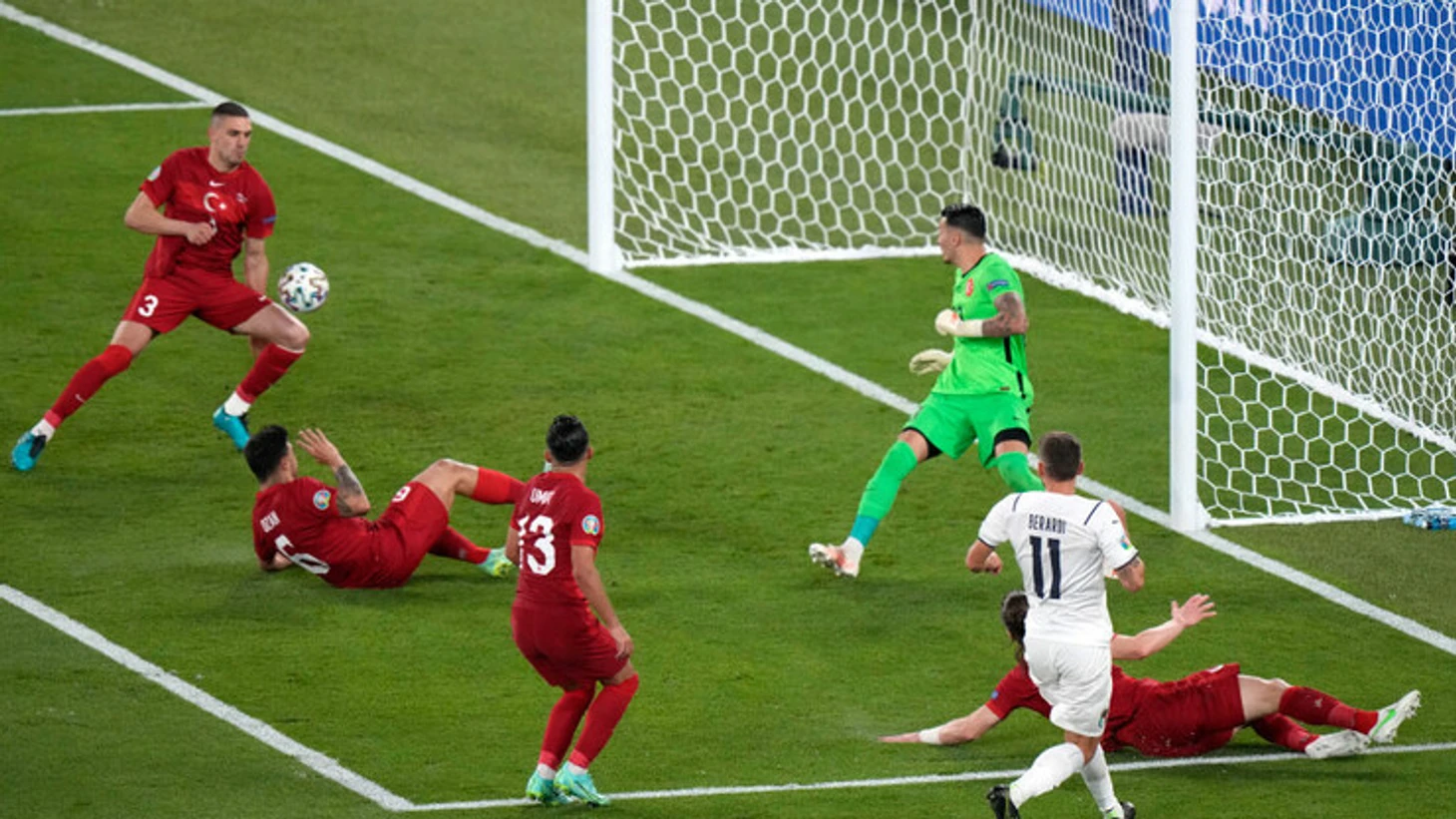 Катастрофическое развитие событий для турецкой сборной. Угурджан Чакыр совершает грубейшую ошибку, выбивая мяч от ворот на левый фланг. Последующая четырехходовка с правого фланга на левый, и Лоренцо Инсинье после передачи Чиро Иммобиле наносит хлесткий удар метров с 10.