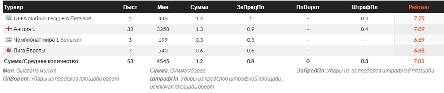 Ни в Лестере, ни в сборной, где у него в принципе схожая позиция и задачи он не дотягивает до этого показателя. Его статистику вы можете увидеть ниже: 1.4 удара за Бельгию в Лиге Наций, 0.3 – в квалификации на ЧМ; 1.3 удара за Лестер в АПЛ и 0.6 – в ЛЕ. Тем более из-за пределов штрафной он наносит в среднем не более 1 удара, а из штрафной в этом матче едва ли получится ударить. Со второго этажа после стандарта – габариты не позволят, при позиционных атаках он даже до штрафной не дойдет, а если получится контратаковать – значит Бельгия уже ведет в счете и не факт, что Юри будет активно поддерживать атаку.