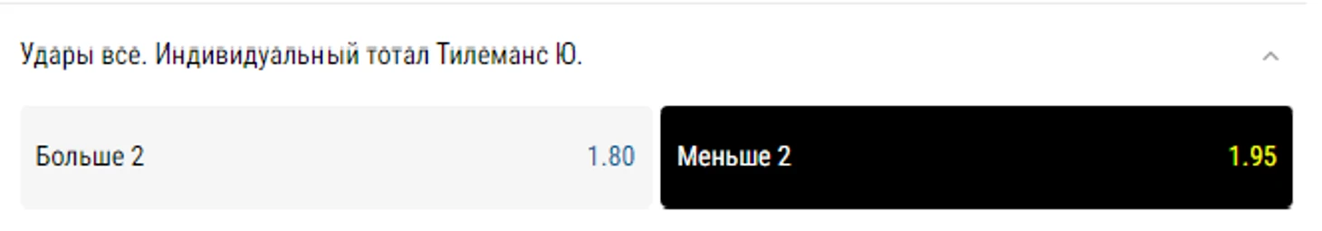 Но хотелось бы перейти к персоналиям. Самый интересный вариант, на мой взгляд, связан с Юри Тилемансом. Юри не относится с тем футболистам, которые ищут зону для удара, часто прибегают к этому. У него прекрасный пас, он постоянно ищет варианты для обострения, для вывода партнеров под ударную позицию в том числе, но не себе. Юри располагается довольно глубоко и без очень удобной позиции, наудачу, бить не станет. Париматч предлагает тотал на 2 удара от Тилеманса. Как минимум не проиграть такой вариант должен.