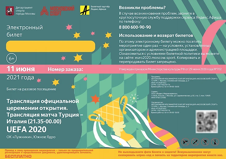 Во-первых, за пару дней до посещения нужно зайти на сайт (https://euro2020.moscow.sport/), зарегистрироваться и получить бесплатный билет на электронную почту. Выглядит он так.
