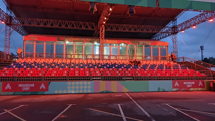 А вот трибуна в цветах российского триколора только для избранных. Стюарды на вопрос, как туда попасть, отвечают очень просто: «Никак». Во время матча-открытия на этой трибуне было около 10 человек.