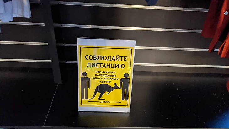 В фаншопе из необычного несколько сувениров и оригинальная табличка про социальную дистанцию.