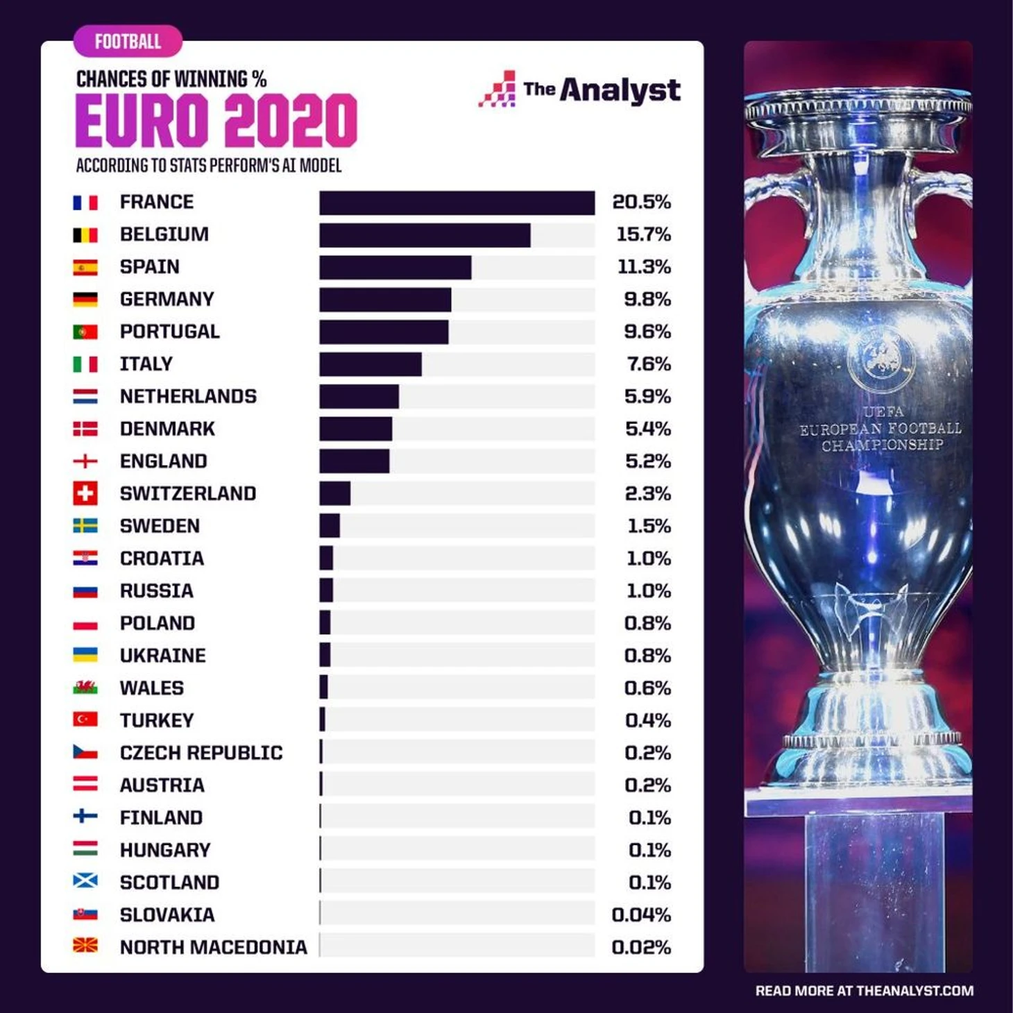 Спортивный сайт «The Analyst» проанализировал и прогнозировал шансы сборных на победу Евро 2020 (2021) на % соотношении. Проанализируем шансы на успех каждой из них.