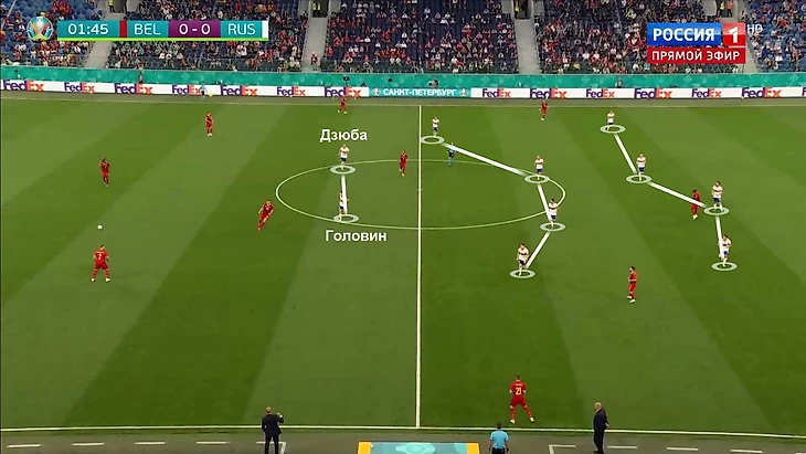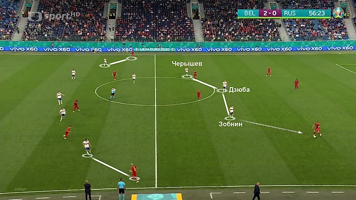 10. При прессинге к Черышеву и Дзюбе выдвигался Зобнин, что позволяло накрывать тройку защитников Бельгии, а на флангах из-за пятерки защитников теперь играли персонально:
