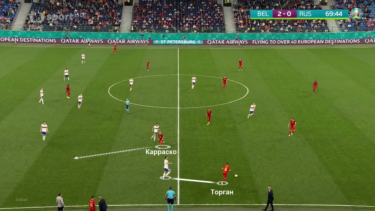 По ходу эпизода Карраско становится ответственным за фланг, а Торган уходит в центр поля, где оказывается свободным игроком – Бельгия получает легкий вариант для контроля: