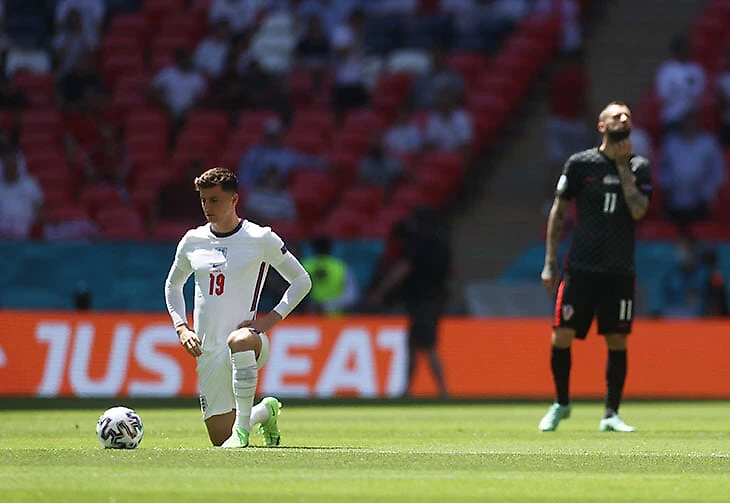 Перед матчем трибуны освистали гимн Хорватии, а вот преклонение колен, вокруг которого было столько разговоров, встретили по-разному. Перед матчем с обращением выступила Футбольная Ассоциация: «Как команда неоднократно повторяла, футболисты будут вставать на колено перед матчами во время турнира. Они будут делать это в знак мирного протеста против дискриминации, несправедливости и неравенства. Это важно для игроков и ценностей, которые коллективно представляет команда. Не может быть никаких сомнений в том, почему футболисты встают на колено и что это значит в футбольном контексте. Мы призываем тех, кто выступает против этого действия, задуматься над посланием, которое вы отправляете футболистам, которых поддерживаете. Пожалуйста, уважайте их пожелания и помните, что мы все должны объединиться в борьбе с дискриминацией. Они сделают для вас все, что в их силах. Пожалуйста, сделайте для них все возможное».
