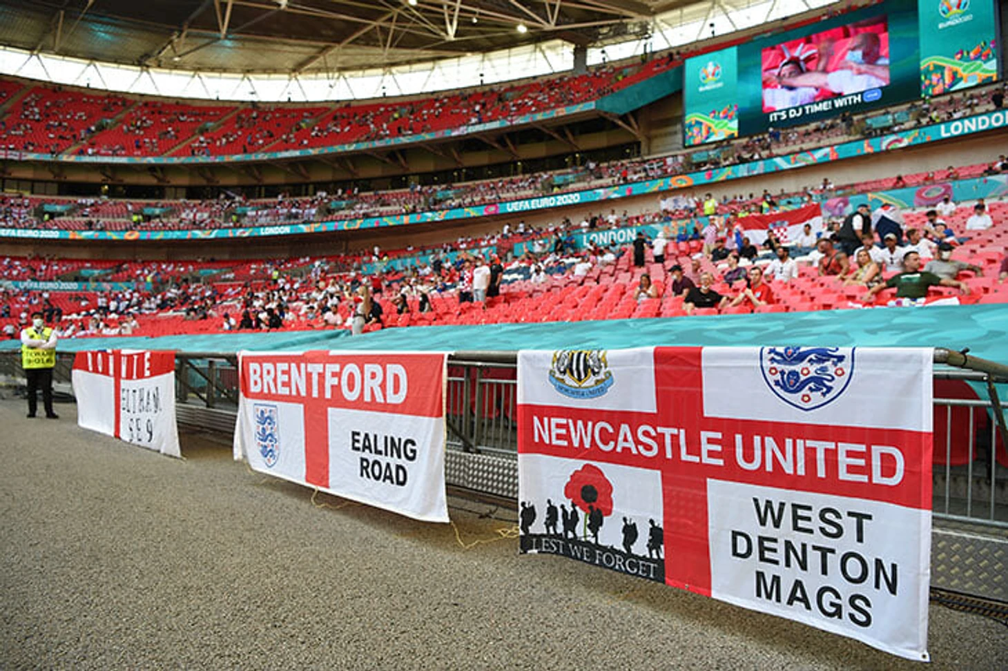 Даже до пандемии матчи сборной Англии на «Уэмбли» чаще всего превращались в довольно унылое зрелище: песен болельщиков хватало на первые минут 10, а затем сборная едва ли не в тишине буднично раскатывала Болгарию или Черногорию с разницей в 4+ мяча. Давний тренд «на выезде фанаты чаще всего громче, чем дома» сработал и здесь: под громкое исполнение It’s coming home Англия начала очень бодро, упустив несколько возможностей открыть счет, а затем трибуны затихли, игра переместилась в центр поля, заставляя болельщиков редко недовольно гудеть. К концу первого тайма на тихо бубнящем «Уэмбли» лучше всего было слышно хорватов: несколько десятков человек собрались в углу сектора и постарались скандировать чуть организованнее.