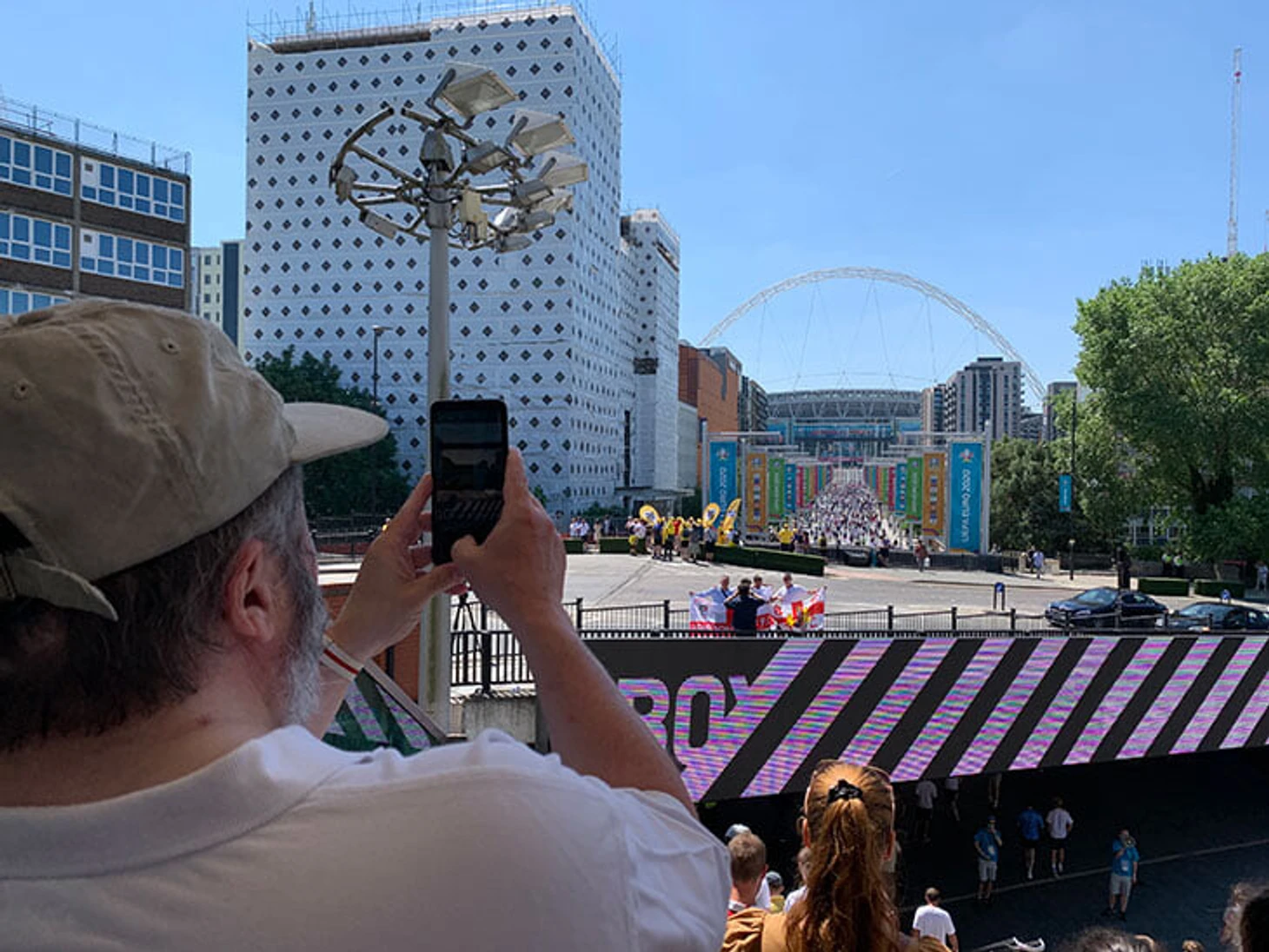 Англичане же без проблем захватили все окрестности «Уэмбли», создавая пробку на выходе из метро. Ближайшая к стадиону станция расположена на возвышенности, так что из вестибюля открывается вид на ведущую к арене аллею, которую невозможно не сфотографировать.