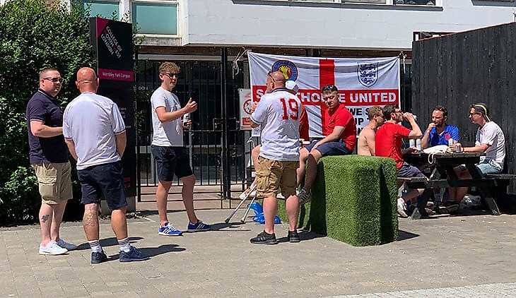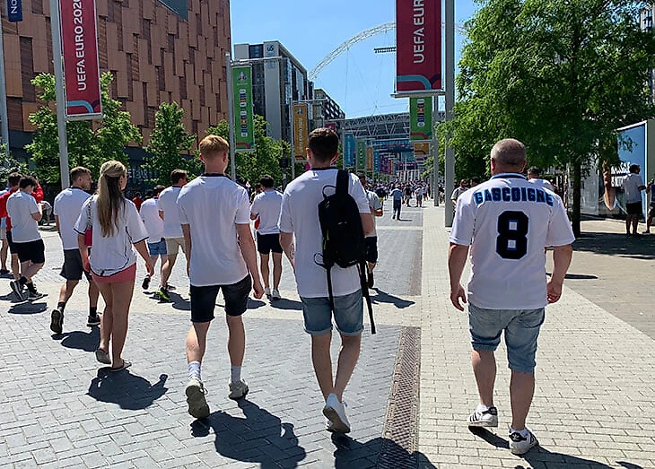 Хорошая погода, работающие пабы со спортивными трансляциями, накрывающее страну перед любым турниром ощущение «сейчас Англия всех порвет!» (и It’s coming home) – предвкушение витало в воздухе, социальных сетях и личных разговорах. Правда, баннерами с символикой турнира центр Лондона начали завешивать только неделю назад, а англичане в майках сборных начали появляться в общественном транспорте только в день первого матча сборной.