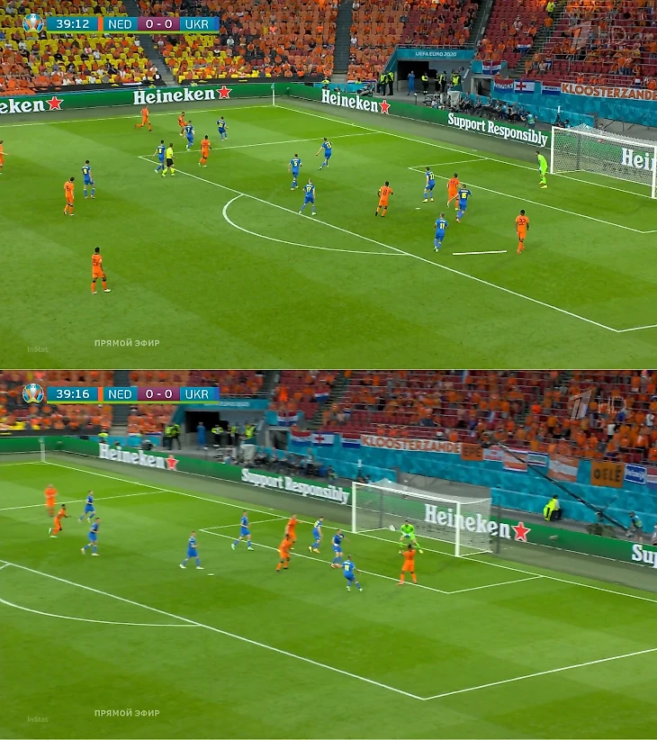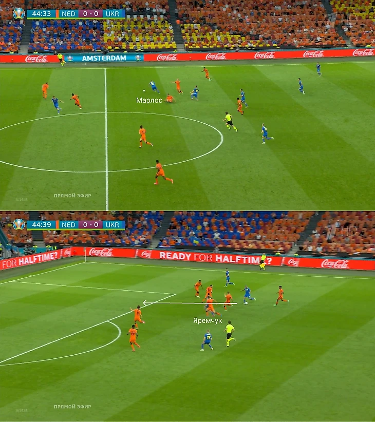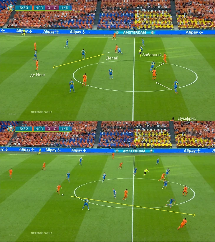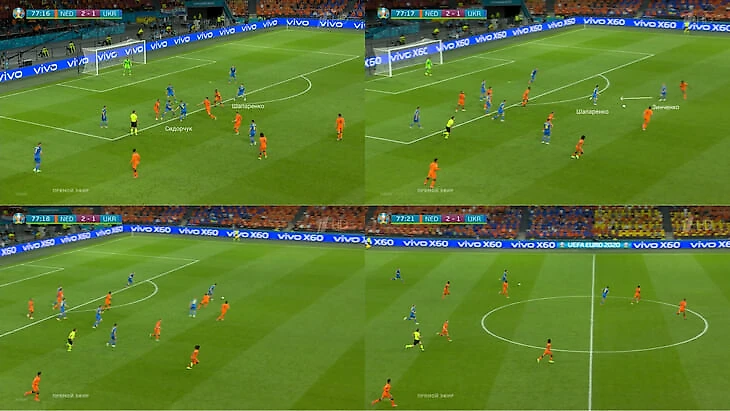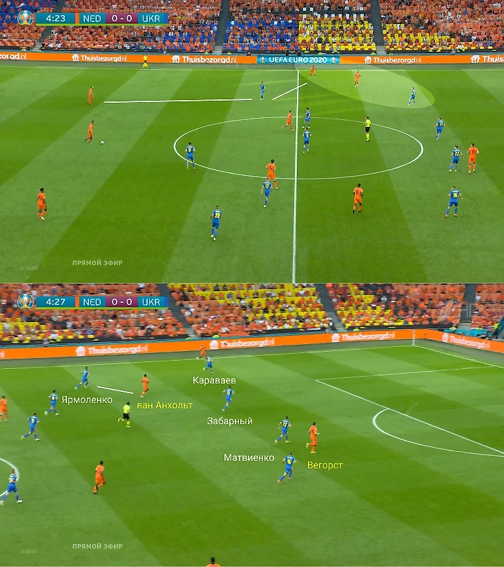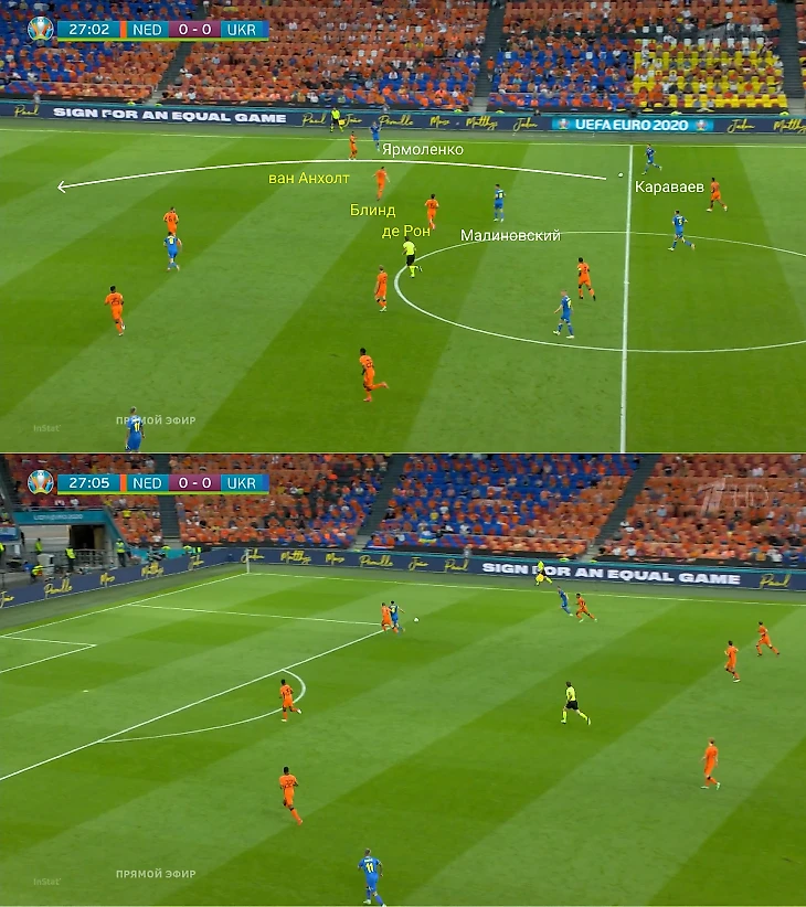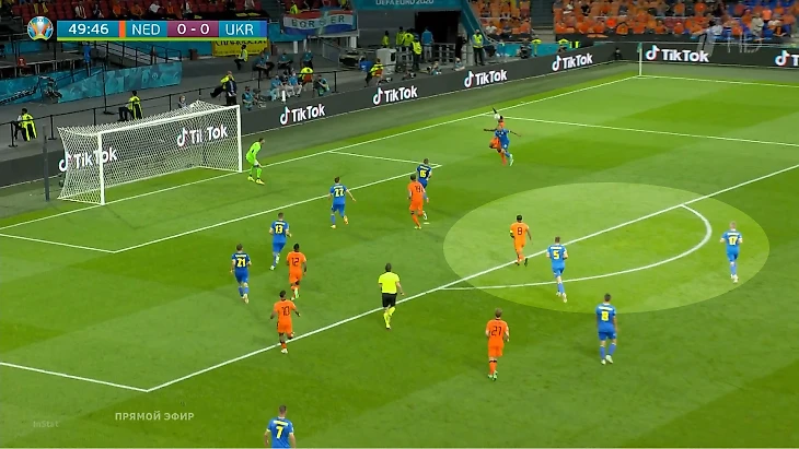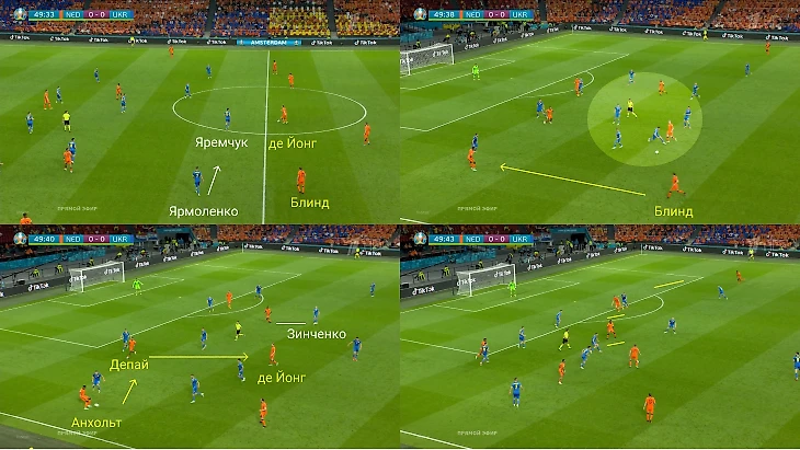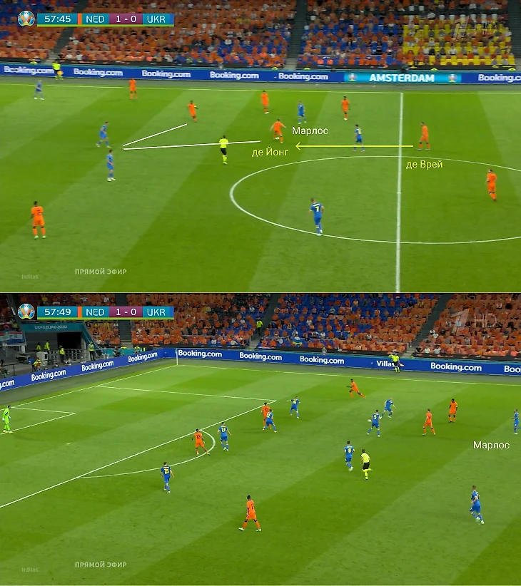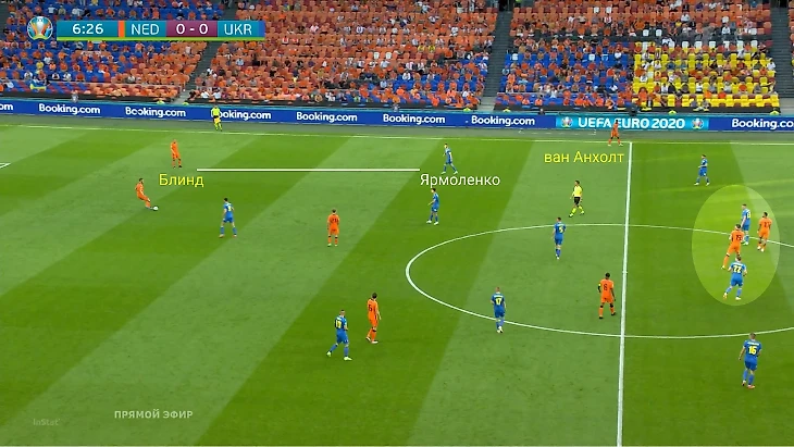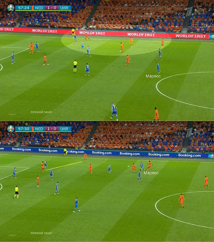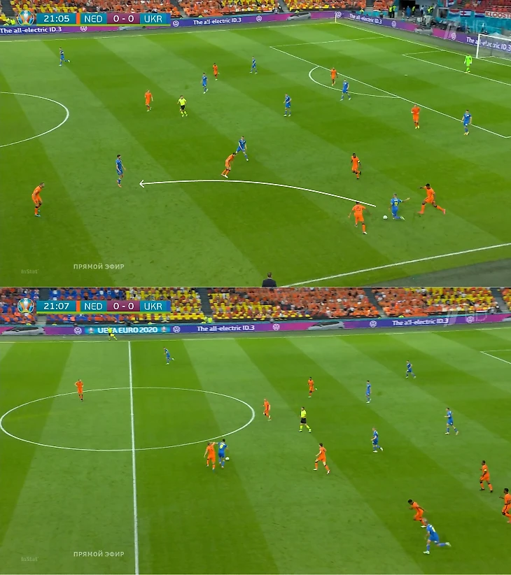 Первый пример: Нидерланды свободно владеют мячом на своей половине поля. Ярмоленко в полупозии и выдвигается на Блинда только после приема. Ван Анхольт создает ширину, а Депай и Вегорст грузят Забарного и Матвиенко.