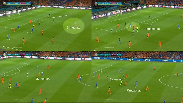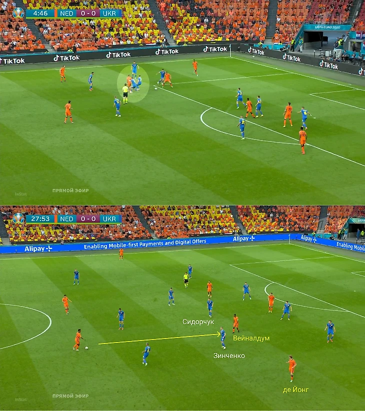 В опорной зоне тоже было не все в порядке. Украина часто теряла там игроков и проигрывала подборы. Основная причина – неверные позиционные решения. Например, в первом эпизоде Сидорчук выбросился на Депая вместе с Малиновским. Мяч проскочил через них и оказался затем у правого латераля Думфриса. Во втором эпизоде сверху застрял Марлос, а Сидорчук опоздал к Вейналдуму, хотя они находились рядом и передача читалась (плюс его передал Зинченко, чтобы сосредоточиться на Френки де Йонге).