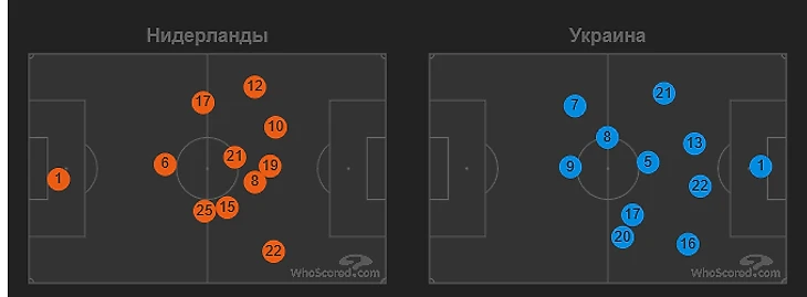 Позиционная игра тоже в пользу де Бура: сразу 39% игрового времени Нидерланды провели в чужой финальной трети (Украина на трети соперника – всего 18%). Этот вывод дополняют усредненные позиции украинцев. Только два игрока (Яремчук и Ярмоленко) на постоянной основе пересекали центральную линию.