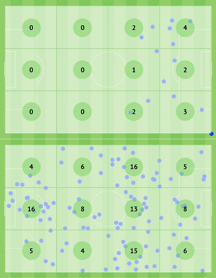 Благодаря движению латералей и атакующей тройки Нидерланды контролировали фланги и растягивали украинскую защиту. Еще проседали опорная зона и прессинг Украины, отсюда доминирование еще и в центре. В общей сложности голландцы сделали 14 точных передач в штрафную (верхняя картинка – карта передач), плюс сделали подборов, перехватов и отборов (картинка ниже) в чужой опорной зоне не меньше, чем на своей половине поля (на графиках ворота Украины – справа). Это привело к 6 ударам по воротам, 2 из которых превратились в голы и еще 3 были очень опасными.