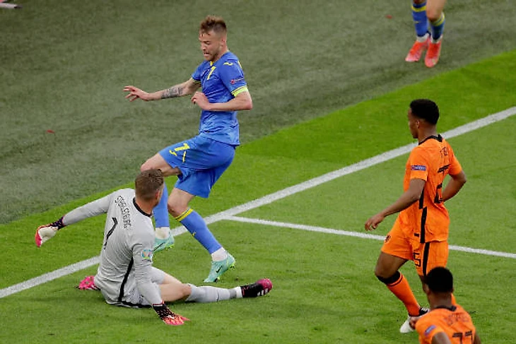 В конце первого тайма Ярмоленко с правого фланга выскочил на ворота. Стекеленбург выскочил из ворот и закрыл угол.